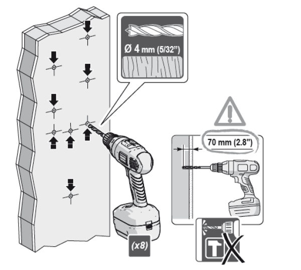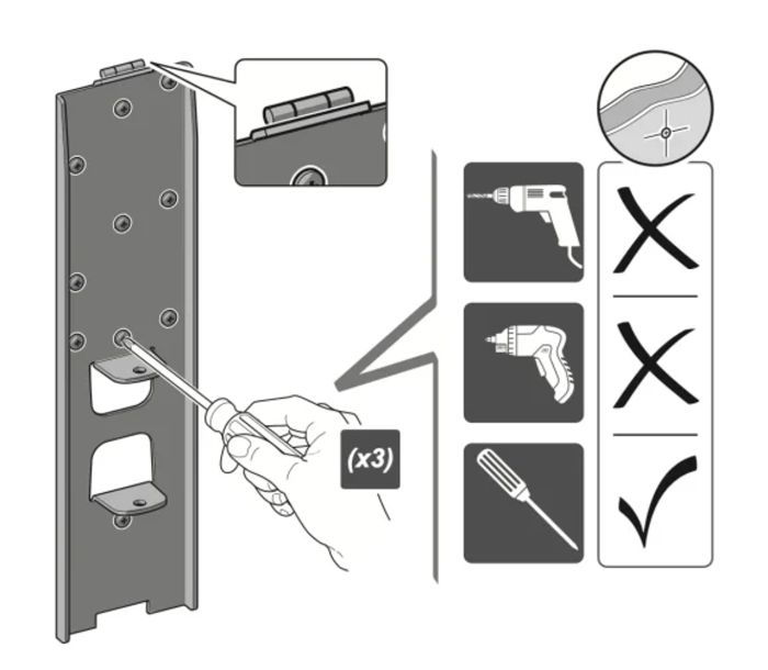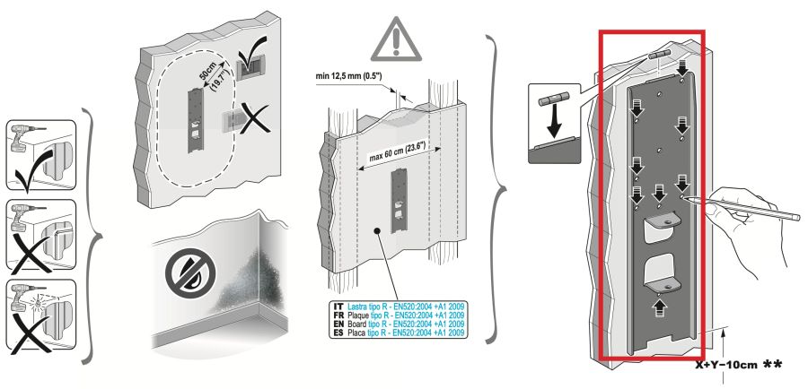 After taking measurements, install the wall mount bracket on the drywall with a thickness ranging from 12.5 mm to 25 mm.